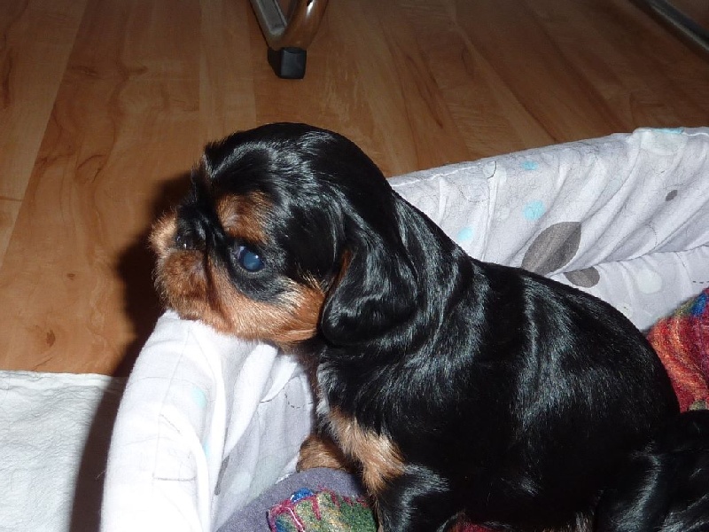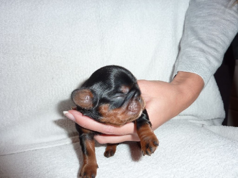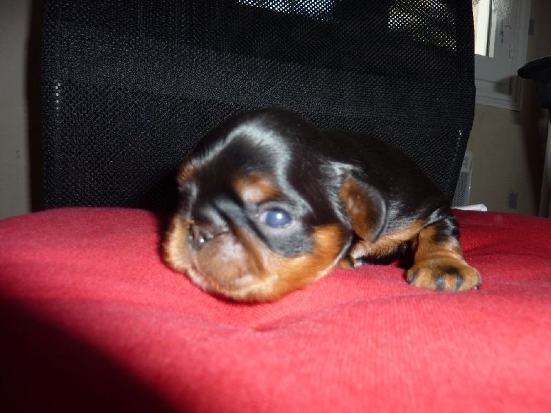 Un beau chiot mâle, poids de naissance 196 gr, noir et feu comme maman avec de belle marque de feu, très vigoureux.